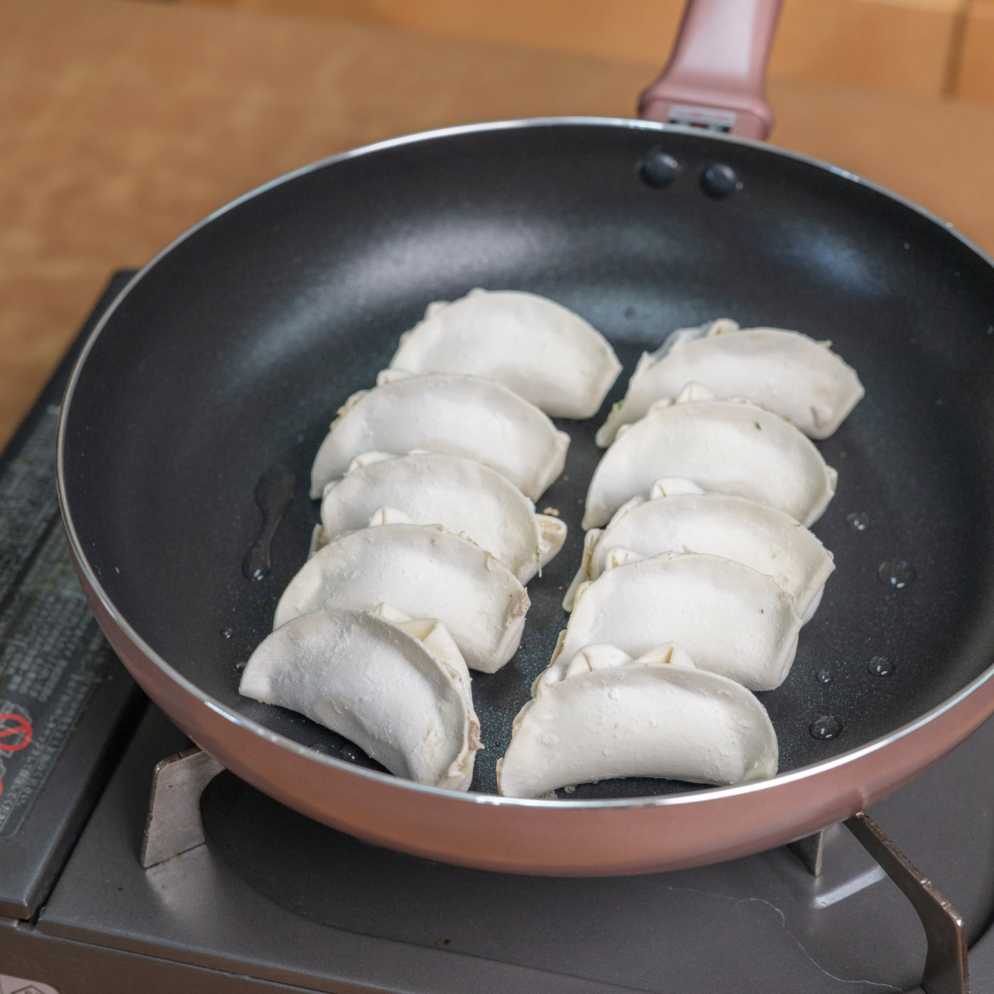 熱したフライパンに薄く油を引き、凍ったままの餃子を並べます。