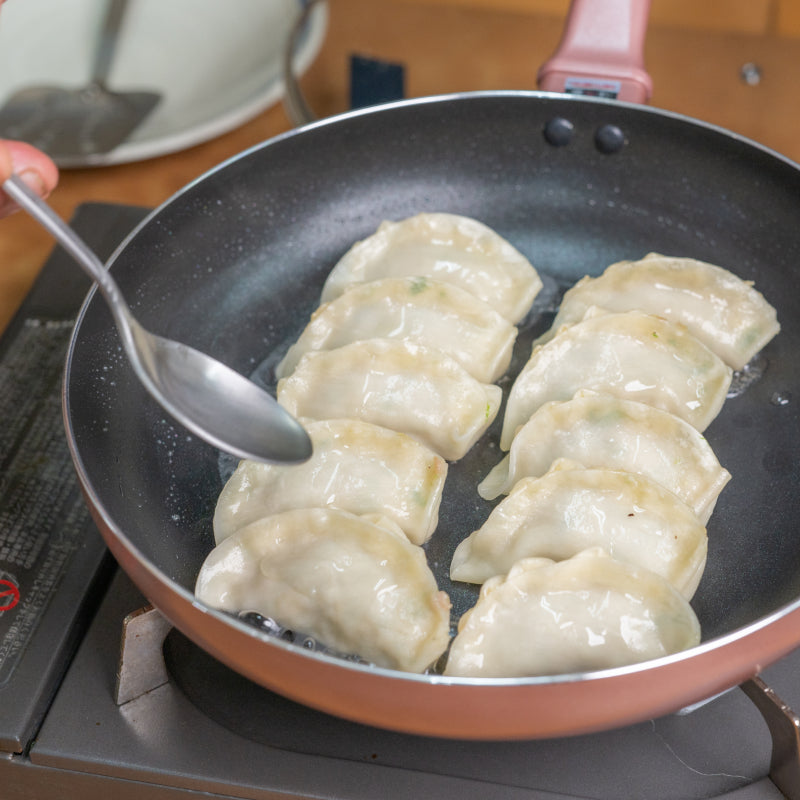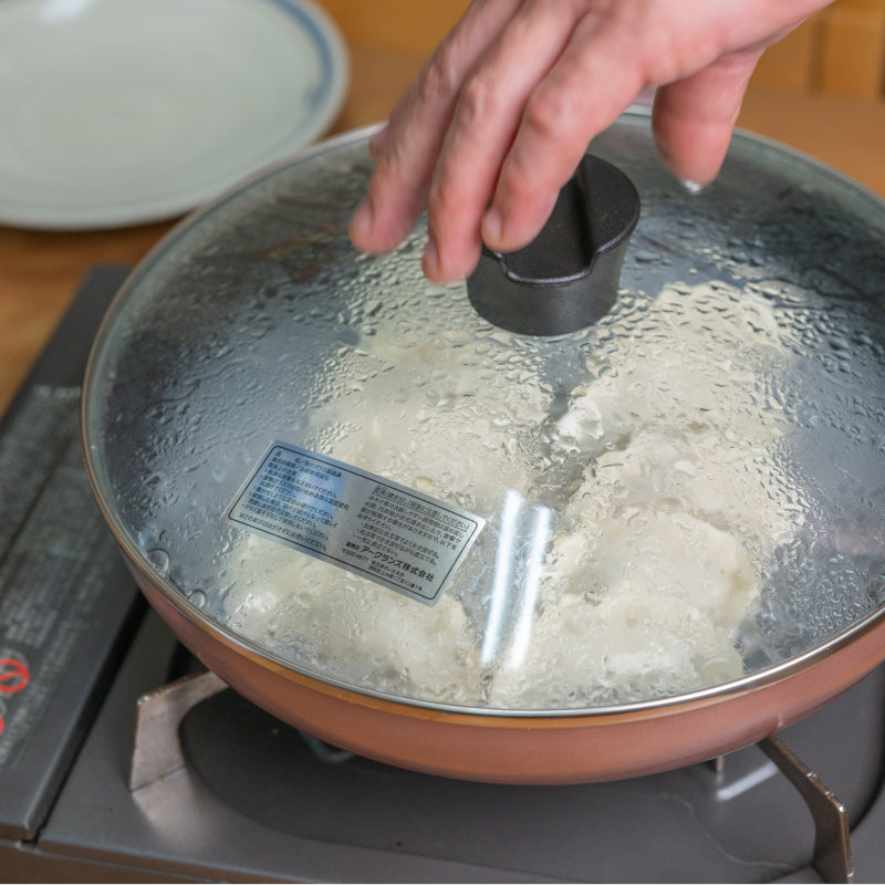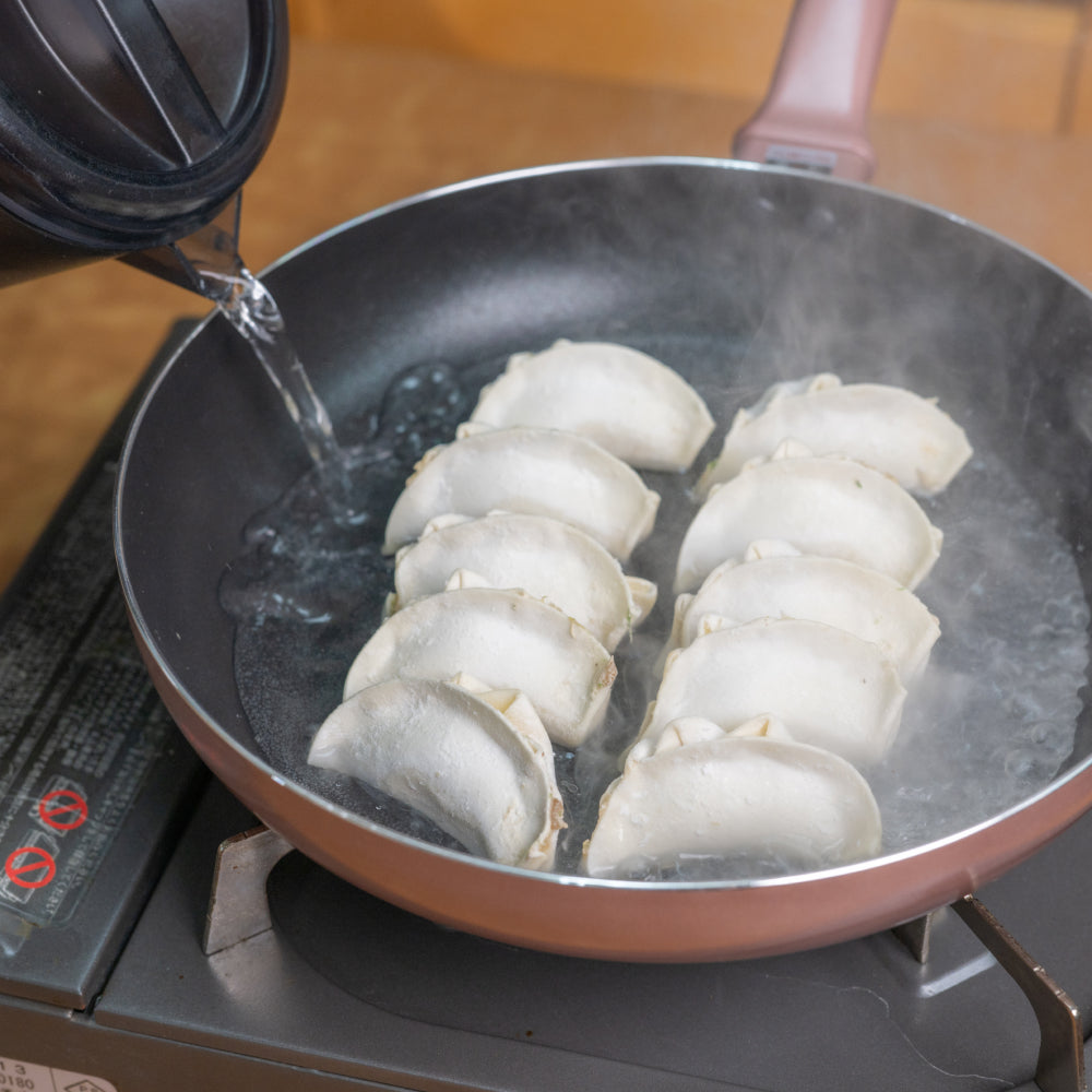 餃子が半分隠れる量の水を入れます。フタをして強火にかけ、沸騰したら強火のまま5分蒸し焼きにします。